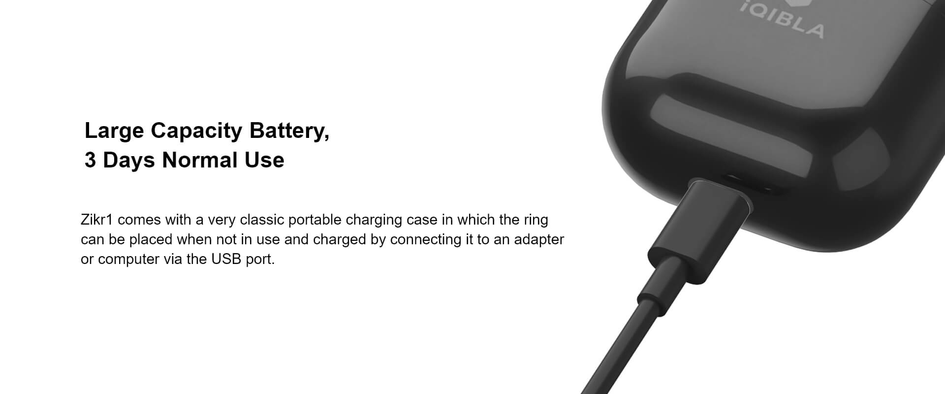 Zikr1 is World’s First Tasbih Smart Ring for Muslims. New 2022 Zikr1 Tasbeeh is made up of Aluminium Alloy , which is half metal ring and it weights only 11.7g. This Zikr1 Tasbeeh has 5 times prayer reminders with built in Bluetooth & Zikr1 is easily connected to iQibla mobile app. You can receive 5 prayer time reminders via Zikr1 or the smartphone app. Tasbeeh Smart Counter Zikr1 has an integrated metal CNC Button so that you can easily keep track of your daily tasbeeh count at all times. Click the button to count and the Zikr1 vibrates when the count reaches 33,66,99 or 100. Zikr1 has a built in 0.49″ OLED Display showing the time , number of chants and prayer times. This Zikr1 tasbeeh offers a lighter and more comfortable wearing experience. This Zikr1 tasbeeh has a large capacity battery. It comes with a very classic portable charging case in which the ring can be placed when not in use and charged by connecting it to an adapter or computer via the USB port. With built in bluetooth 5.1 , Zikr1 can quickly connect to the iQibla app , get accurate Qibla direction and synchronise data with your smartphone and Qibla watch.