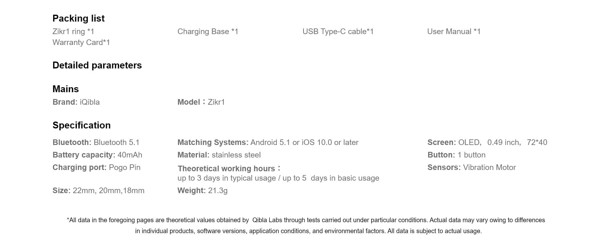 Brand: iQibla Model:M02 Specification Bluetooth: Bluetooth 5.1 Matching Systems: Android 5.1 or iOS 10.0 or later Screen: OLED,0.49 inch,72*40 Battery capacity:40mAh Material:Aerospace Aluminium Button:1 button Theoretical working hours: up to 7 days in typical usage...